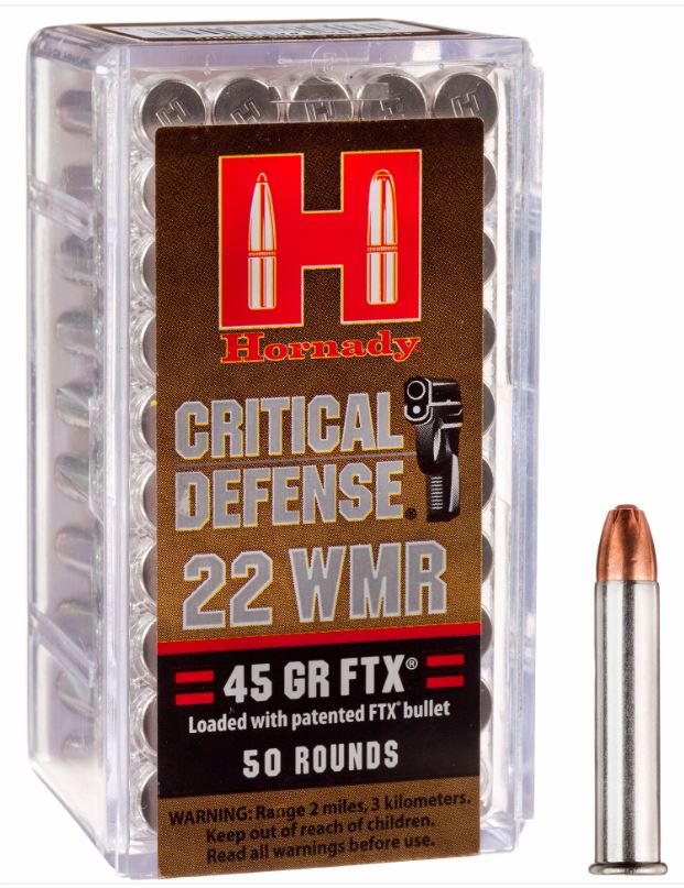Bringing the performance of Hornady®'s best self defense ammunition to rim fires, Critical Defense® .22 WMR Rimfire Ammo delivers effective, consistent, and reliable self-defense. Critical Defense rounds utilize Hornady's clean burning and stable propellants for reduced recoil, consistent performance in all temperatures, and minimal muzzle flash to protect night vision. Unaffected by thick and heavy clothing, these rounds feature a 45-grain FTX bullet with Flex Tip. This specially designed bullet delivers superior controlled expansion, flat trajectory, and large, deep wound cavities over a wide range of velocities. High-visibility shiny silver nickel-plated case resists corrosion. 1700 fps.